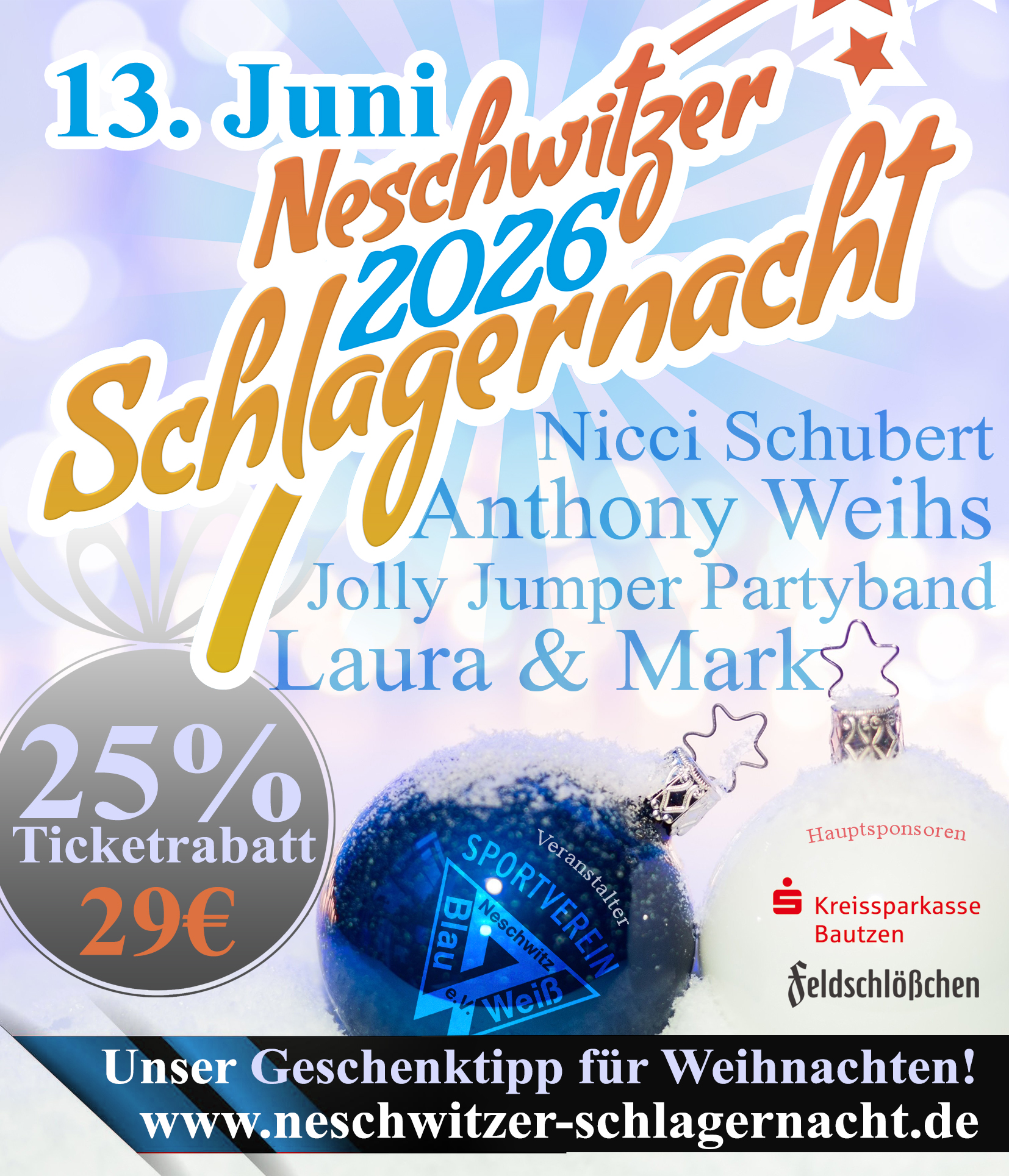 Wie wär’s mit Tickets für die Neschwitzer Schlagernacht 2026 am 13.06.2026? Perfekt als Geschenk für alle, die gute Musik, Sommer-Nacht-Vibes und Konzerterlebnisse lieben.